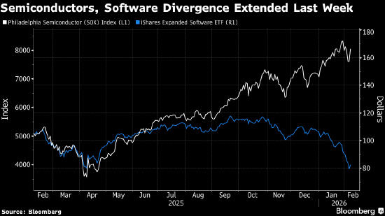 半导体及半导体设备板块,连同IT服务板块,成为当周少数出现净买入的科技相关领域。半导体股票指标上周上涨,加剧了芯片股与软件股之间的分化。这种分化近月持续扩大,因投资者惩罚那些他们担忧可能被人工智能颠覆的行业。